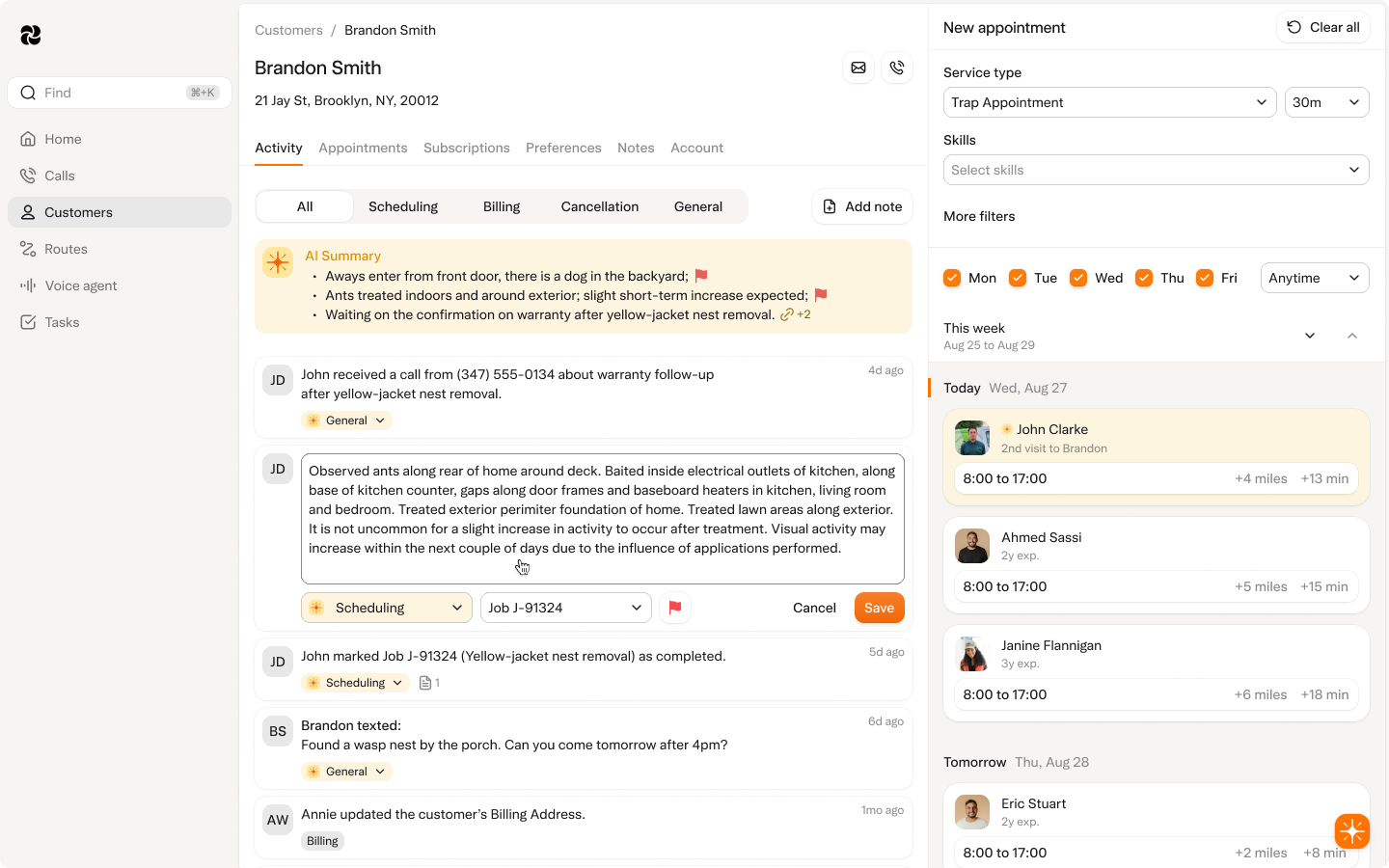 One customer timeline that keeps every call, message, service, and payment in sync.